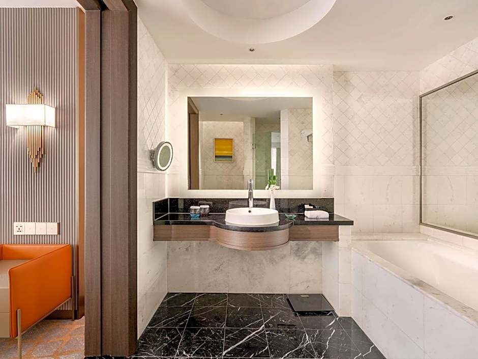 Located on 11-19th floor, this 48-square-yard room features large windows with views of the city and a separate seating area.
